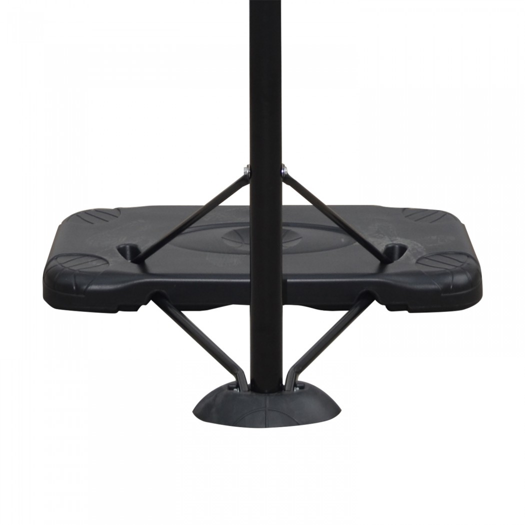 Опорой стойки служит пластиковое основание, в которое для устойчивости всей конструкции необходимо залить воду. Если вы не планируете убирать стойку в помещение в зимнее время, то рекомендуем в основание стойки засыпать песок или залить антифриз. Для перемещения по площадке в основании баскетбольной стойки установлены ролики.