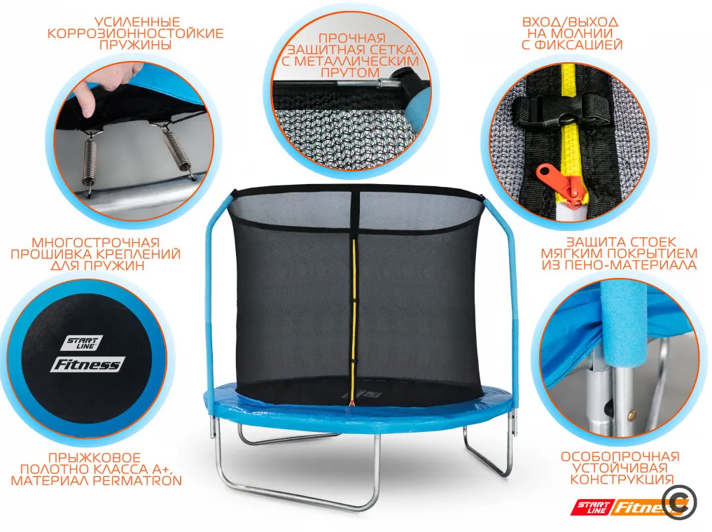 При производстве батутов уделяется особое внимание качеству. Даже на самом маленьком по диаметру батуте используется 48 пружин, это увеличивает высоту прыжка. Поверхность для прыжков выполнена из самого прочного полипропилена последнего поколения "Перматрон". Пружины выполнены из высококачественной стали, которые имеют повышенную защиту от износа и растягивания, тем самым позволяя продлить срок службы батута. Для обеспечения безопасности пружины закрыты защитным чехлом. Внутренняя защитная сетка (в комплекте) обеспечит безопасность от случайного падения. Сетка изготовлена из высокопрочного нейлона, надежно крепится к стойкам батута. Для защиты вход/выход через сетку выполнен на молнии с фиксирующими защелками с внешней стороны.